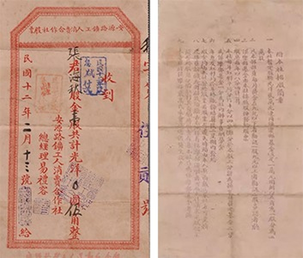江西萍鄉(xiāng)煤礦自1898年開辦起,安源工人便在經(jīng)濟(jì)上深受剝削,礦局拖欠工資,奸商哄抬物價(jià)。為了維護(hù)工人利益,減少商人的中間盤剝,1922年5月中國(guó)共產(chǎn)黨領(lǐng)導(dǎo)的安源路礦工人俱樂部成立不久,便于同年7月創(chuàng)辦了中國(guó)工人階級(jí)最早的經(jīng)濟(jì)組織——安源路礦工人消費(fèi)合作社。隨著規(guī)模和經(jīng)營(yíng)范圍進(jìn)一步擴(kuò)大,消費(fèi)合作社流轉(zhuǎn)資金嚴(yán)重不足,出現(xiàn)了貨品短缺的窘境。為了解決資金不足的問題,1923年初,消費(fèi)合作社決定在俱樂部部員中招股,制定了《招股簡(jiǎn)章》。工人們深信消費(fèi)合作社就是為大家謀利益的經(jīng)濟(jì)實(shí)體,盡管十分困難,仍踴躍認(rèn)購股票,很快就籌集到股金7800余元,連同俱樂部撥來的活動(dòng)經(jīng)費(fèi)一起,共計(jì)資金1.8萬余元。消費(fèi)合作社給每位認(rèn)股者發(fā)了自行設(shè)計(jì)的股票作為憑證。