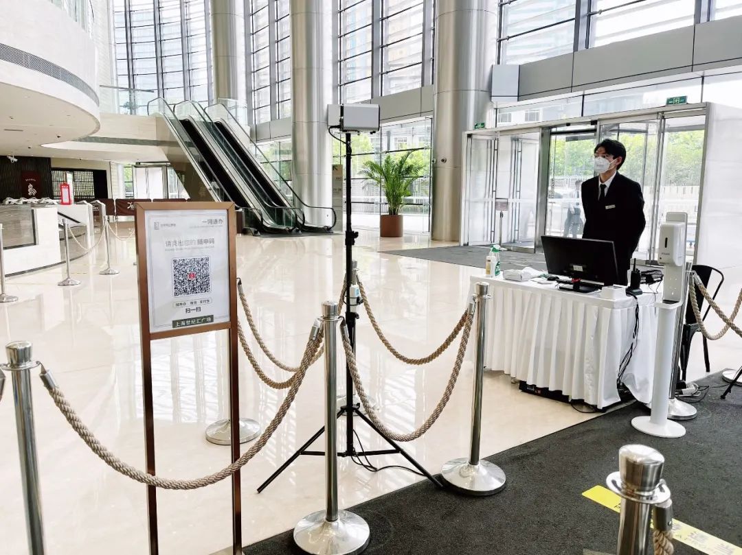 工區大樓布設健康核驗一體機“數字哨兵”,各人員有序掃碼核驗入場。