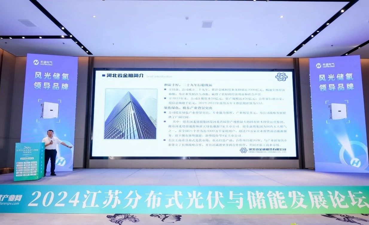 日前,2024年江蘇分布式光伏與儲能發(fā)展論壇在蘇州成功舉辦,河北金租參加此次論壇,與天合光能、晶科電力、阿特斯等行業(yè)伙伴共話清潔能源發(fā)展。河北金租“光易租”繼在川渝亮相后,此次宣介活動走進江蘇,為長三角區(qū)域分布式光伏行業(yè)發(fā)展貢獻智慧和力量。