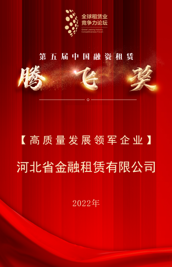 日前,第九屆全球租賃業競爭力論壇年度峰會圓滿召開,河北省金融租賃有限公司(以下簡稱“河北金租”或“公司”)再度攬下中國融資租賃“騰飛獎”,榮獲“高質量發展領軍企業”榮譽。全球租賃業競爭力論壇峰會是一年一度的世界級租賃行業峰…